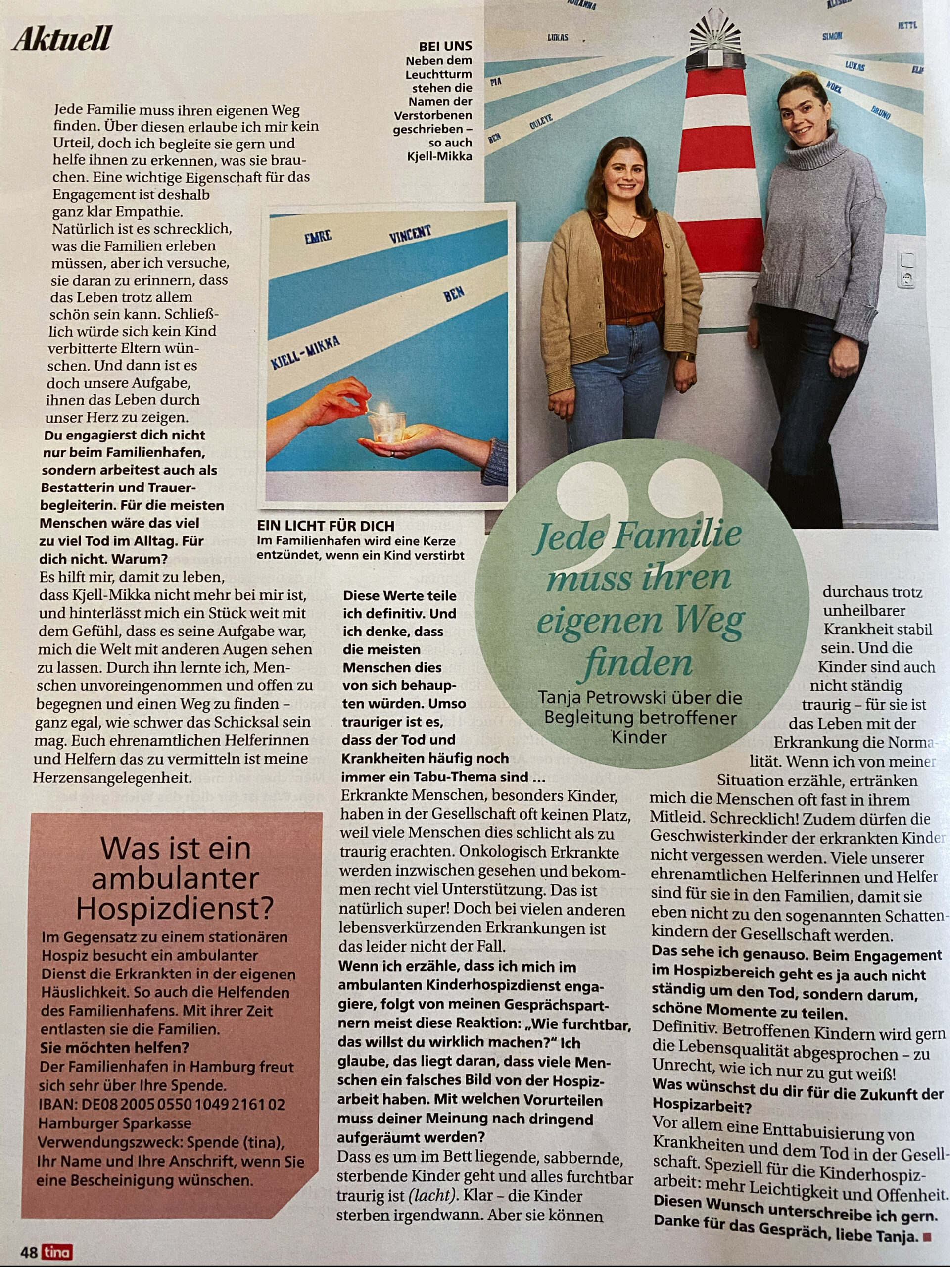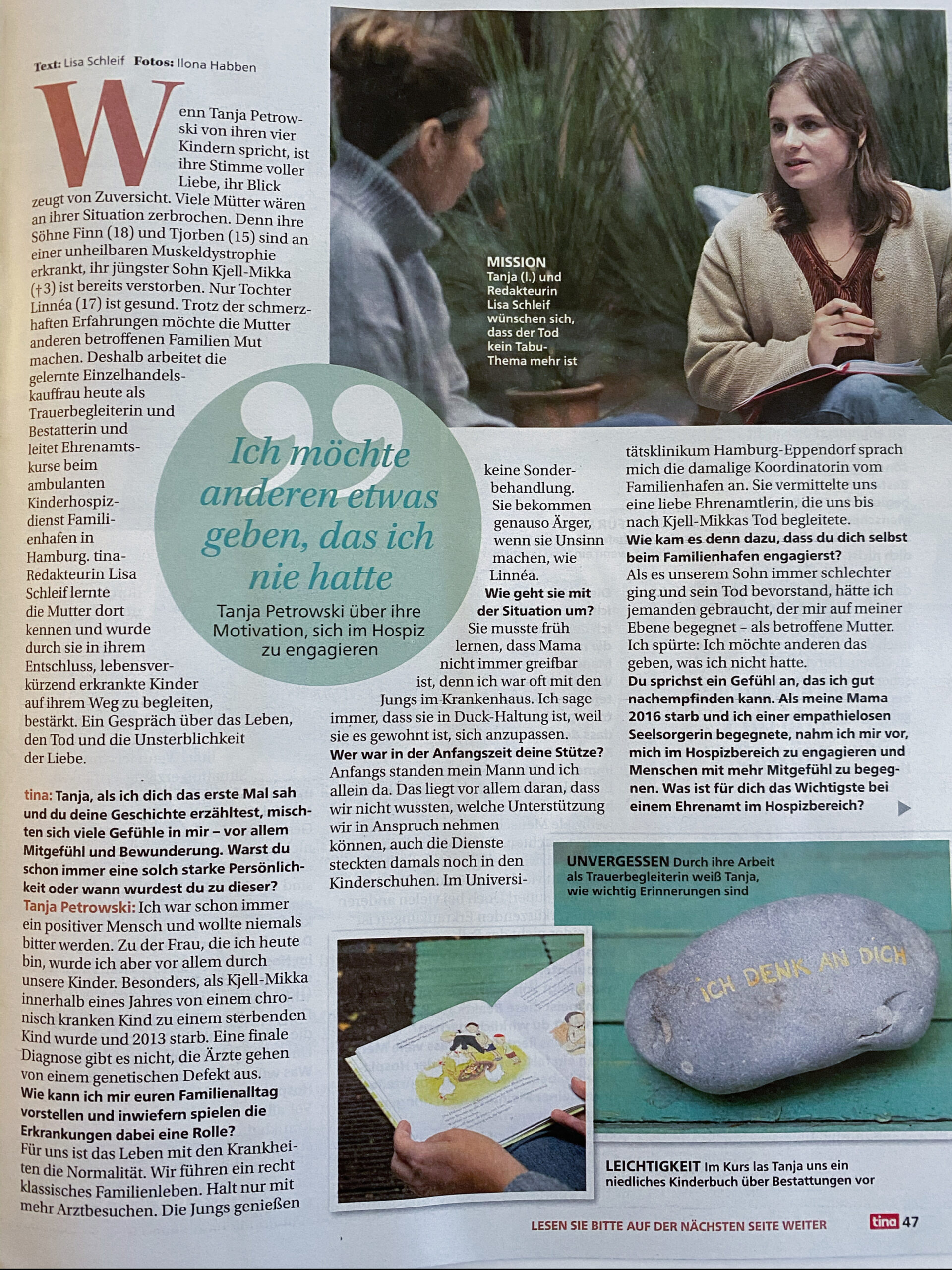Die Zeitschrift „tina“ hat einen sehr schönen und einfühlsamen Artikel über Tanja Petrowski und den Familienhafen veröffentlicht (Ausgabe vom 28.10.2020). Darin berichtet Tanja über ihren Weg als betroffene Mutter, die bereits einen Sohn verloren hat und ihren Umgang mit dem Thema Tod.